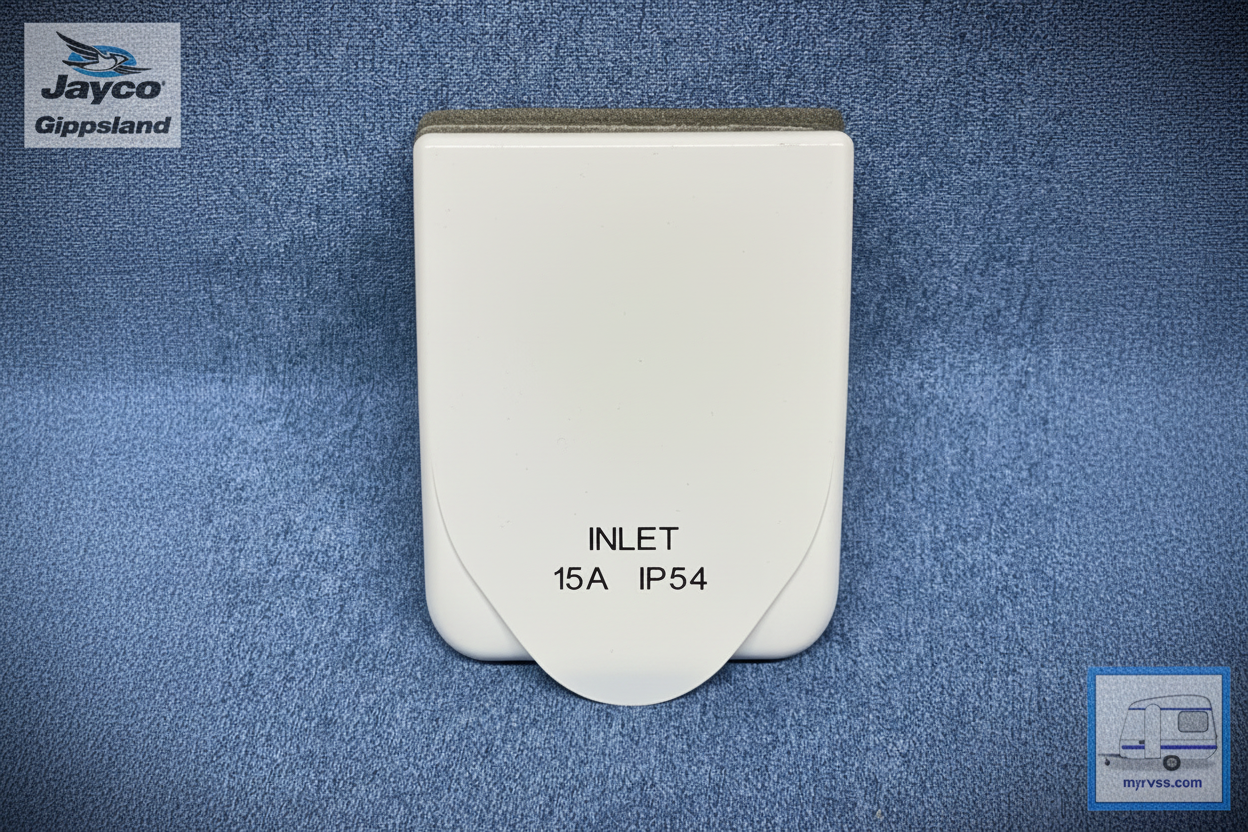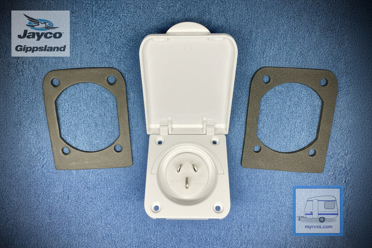 Power Inlet, 15amp with a weatherproof lid. Depending on the wall thickness you may also need a backing plate. These power inlets can replace the discontinued Pre 2006 Clipsal. See below for size comparisons: